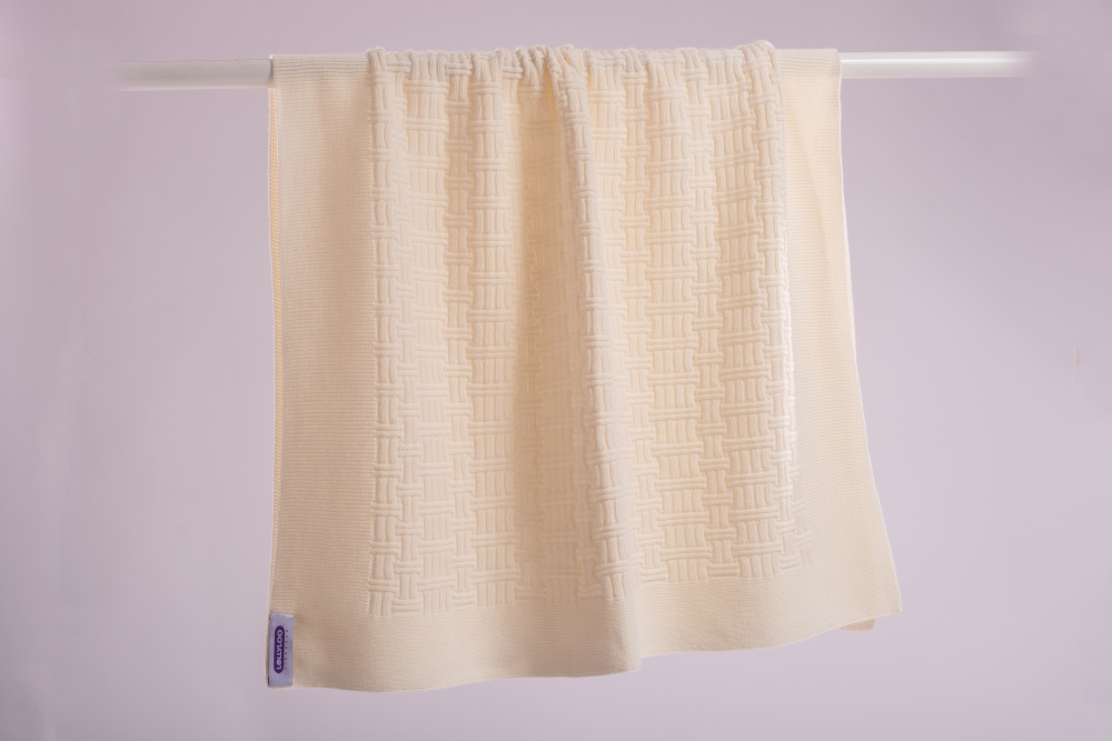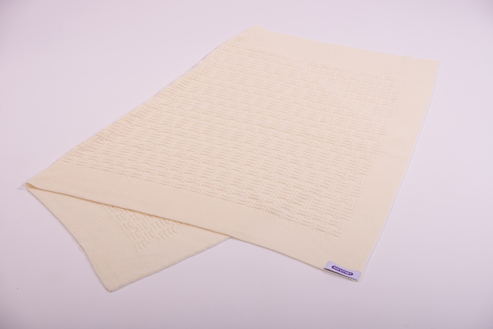 O pătură moale, frumoasă pentru băieți și fete. Tricotata din bumbac organic moale, are un centru tricotat în relief cu o margine tricotată fină.