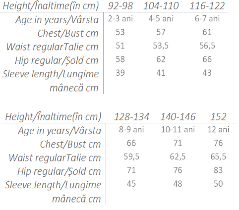| Mărimi | 92-98 (2-3 ani), 104-110 (4-5 ani), 116-122 (6-7 ani), 128-134 (8-9 ani), 140-146 (10-11 ani), 152 (12 ani) |