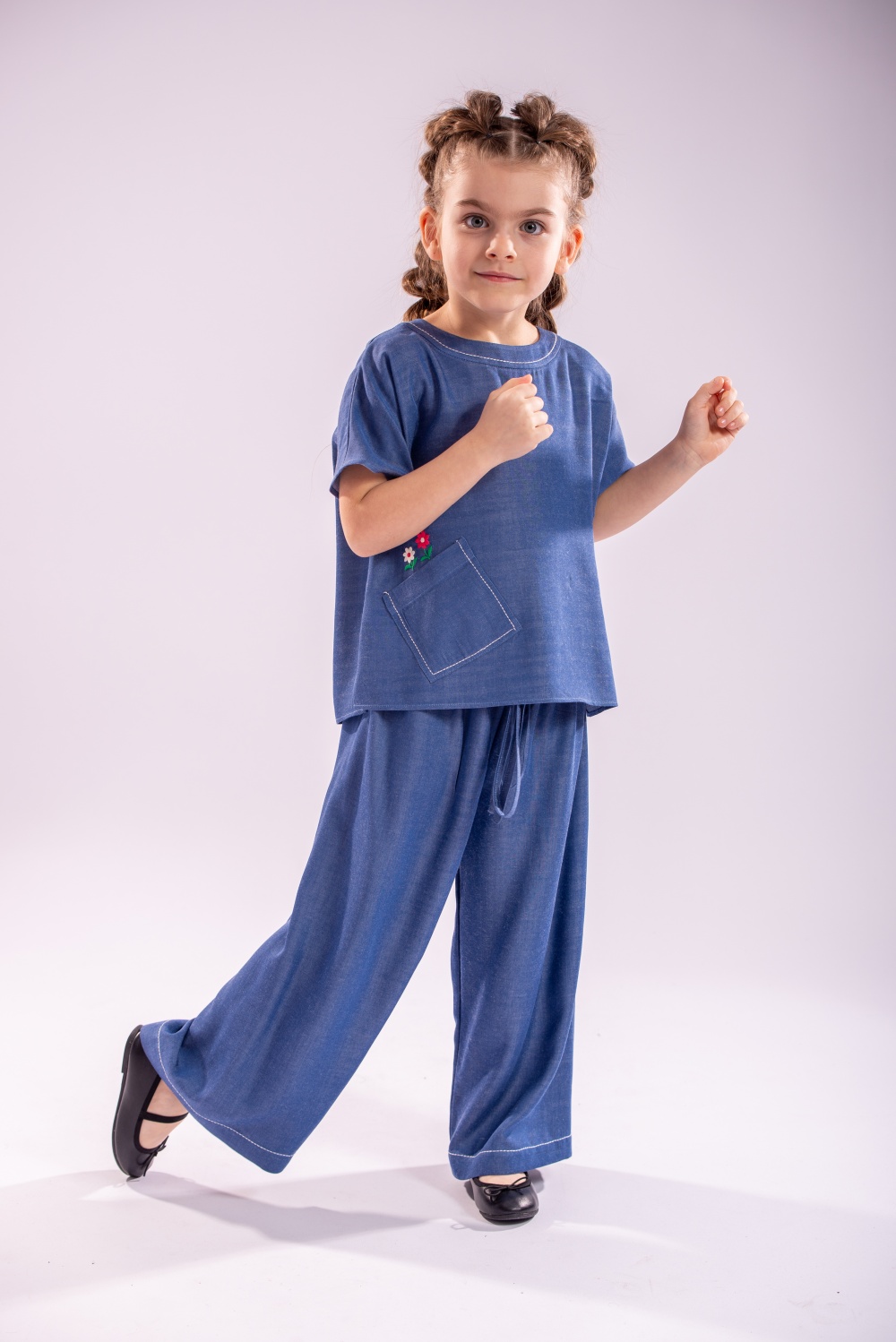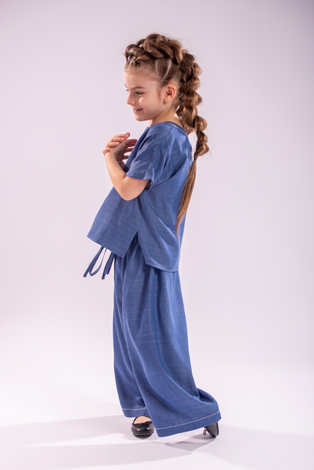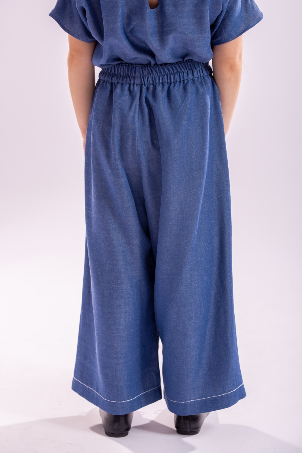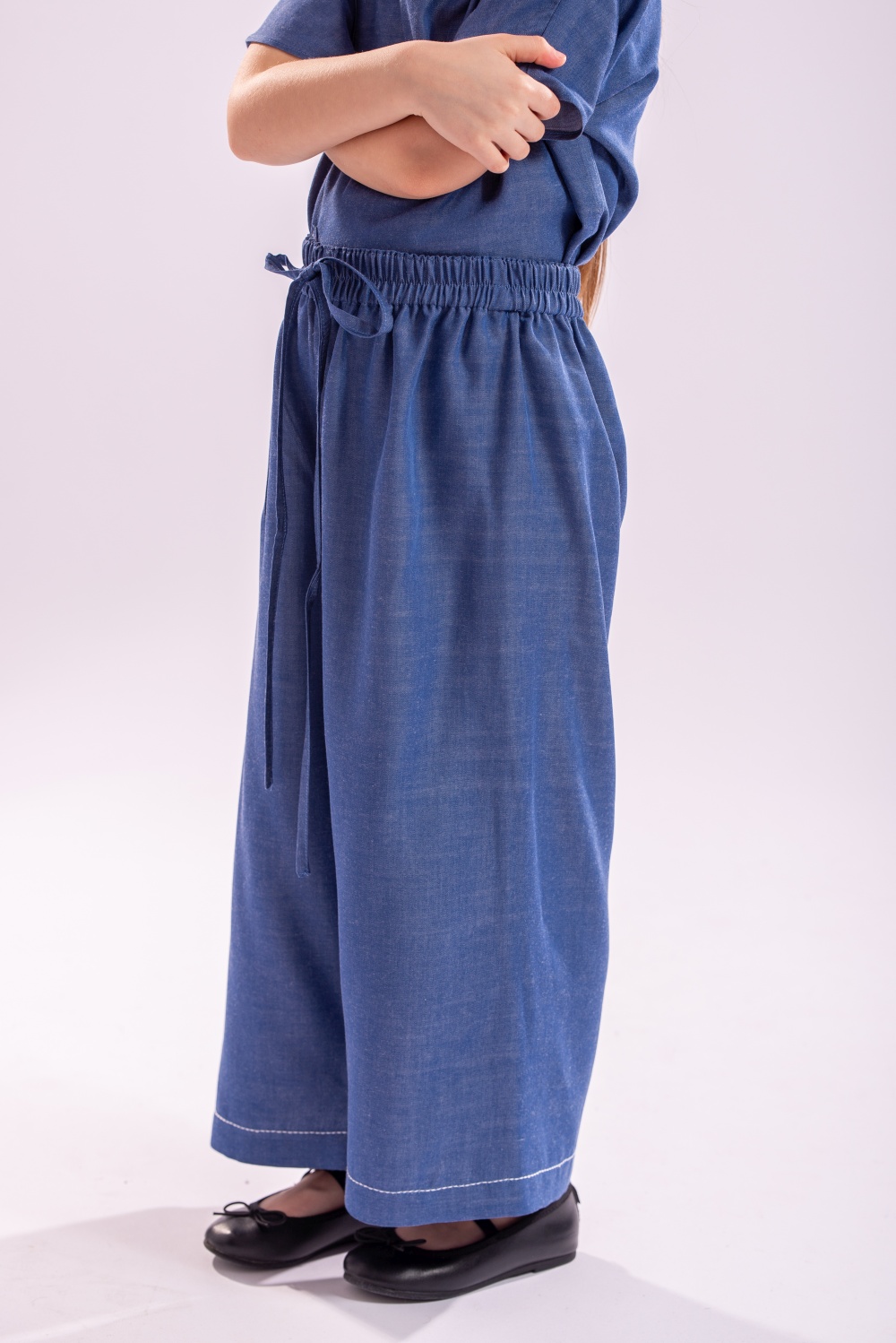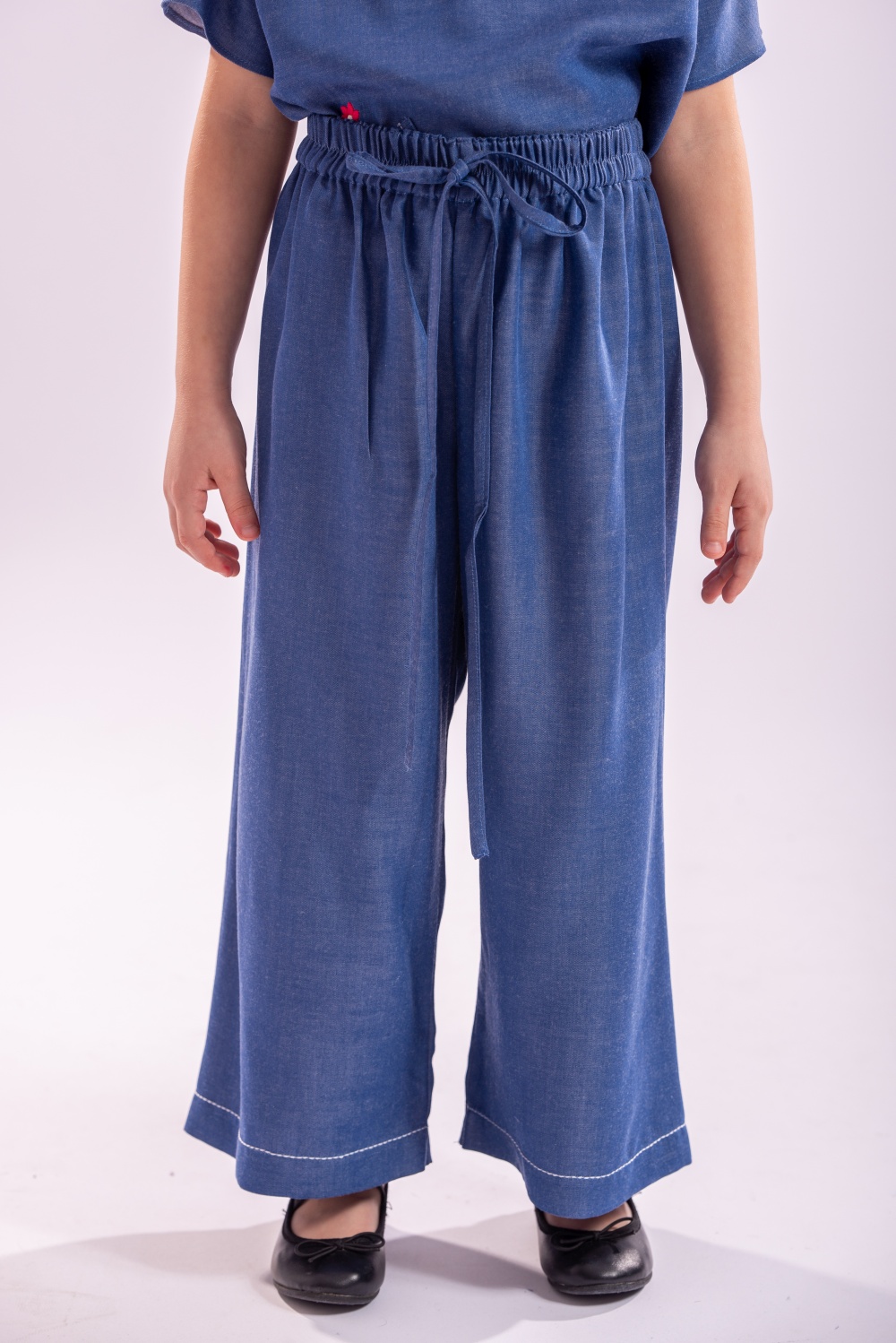 Pantaloni Sigal in still palazzo, cu talie elastica si tighele in contrast la tiv , un model de baza al garderobei fetitei tale. Confectionat din tencel , in culoarea denimului se asorteaza usor oricarei bluze si inspecial bluzei Calla de la Lollyloo.